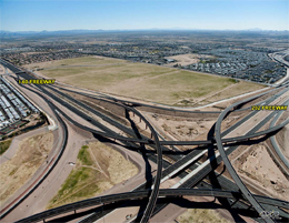 現在の旧名「ザ・クロッシングズ」中心部分航空写真。東西(US60)南北(ループ202)高速道路完成済。